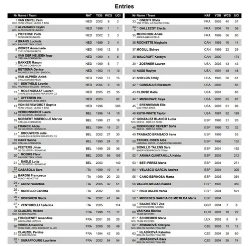 Startlijst. Ronde 13 van de Wereldbeker cyclocross, de voorlaatste, vindt op 21 januari plaats in Spanje. Benidorm is opnieuw gastheer voor een wedstrijd met een sterrenveld.