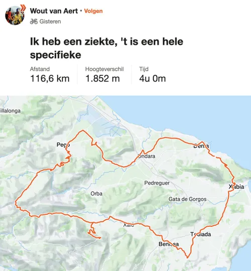 Bij het uploaden van een rit van meer dan 116 kilometer, die precies vier uur duurde, voegde de renner van