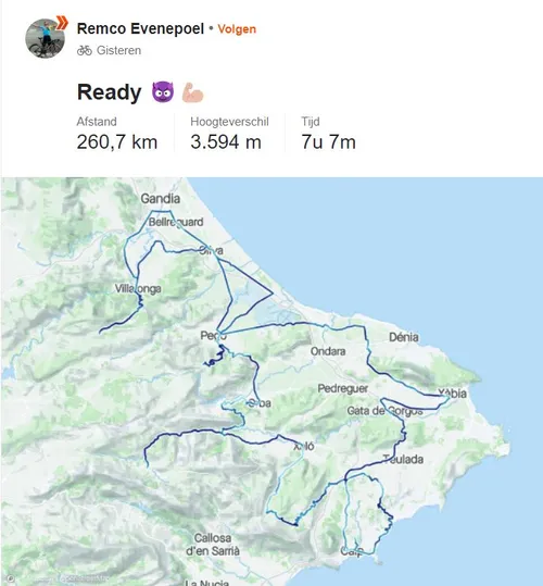 In een indrukwekkende trainingsrit legde hij meer dan 260 kilometer af, met bijna 3600 hoogtemeters, in ruim 7 uur tijd, met een gemiddelde snelheid van 36,6 kilometer per uur. De tweevoudig wereldkampioen beschreef zijn prestatie met slechts één woord: "Ready."