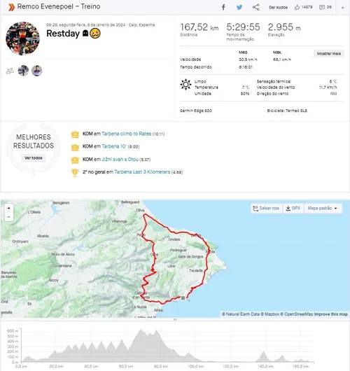 Hoogstwaarschijnlijk een test van zijn vorm, om te peilen hoe het nu verder moet. Volgens Twitter-gebruiker @NaichacaCycling, die regelmatig klimprestaties meet, heeft Evenepoel meer dan 14:30 minuten op 7.09W/Kg gereden in de beroemde Coll de Rates. Hoewel het natuurlijk niet bevestigd is, geeft de schatting inzicht in het huidige klimvermogen van de Belgische kampioen. De indrukwekkende cijfers zouden hem gemakkelijk tot de allerbesten maken in wedstrijden waar hij zich op richt, zoals de Tour de France.
