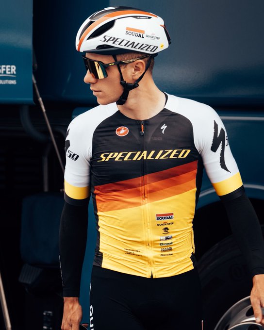 Remco Evenepoel stond in de schijnwerpers, gekleed in een speciaal 50-jarig jubileumshirt van het fietsenmerk Specialized. Specialized is de fietsleverancier van Quick-Step en een van de meest prestigieuze merken in de wielersport, wat maandag veel aandacht trok.