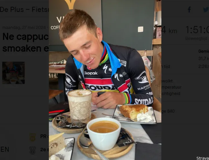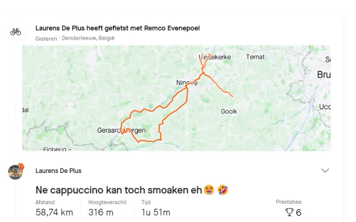 "Ne cappuccino kan toch smoaken eh", plaatste De Plus bij een afbeelding waarop Evenepoel, met een schuimsnor, zijn eerste slok koffie neemt. "Veel geklets, weinig gefiets", antwoordde Evenepoel zelf.
