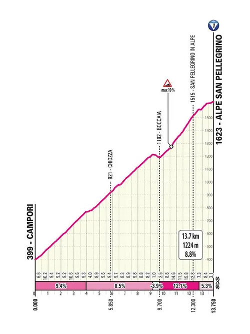 De etappe bevat een zware klim in het begin van de San Pellegrino in Alpe die meer dan 14 kilometer lang is aan 8%, een van de zwaarste in de wedstrijd. Maar als de trekker niet wordt overgehaald, dan hebben we waarschijnlijk een dag voor de kopgroep terwijl de klassementsrenners elkaar zullen schaduwen in de heuvelachtige finale naar Castelnuovo Ne Monti.