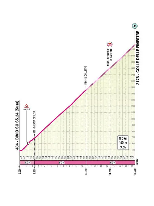De slotklim naar Sestriere is 16 kilometer lang. De eerste helft is relatief rustig, met vals plat, maar de laatste 10 kilometer klimmen met een gemiddeld stijgingspercentage van 5%. Gelegen op grote hoogte, na de brute Finestre en in de slotetappe van de Giro, zou deze klim wel eens een van de zwaarste van de race kunnen zijn. De verschillen in het algemeen klassement zullen hier uiteindelijk worden gemaakt.