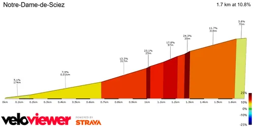 Maar het is in de klim naar de Notre-Dame-de-Sciez (met stijgingspercentages tot 18%) dat we het meeste vuurwerk zullen hebben. Verwacht geen vroege aanvallen, het is een verstikkende klim die langzaam stijgt in stijgingspercentage tot 18% (of misschien 24%, afhankelijk van welk profiel je meer vertrouwt). Er worden gaten verwacht op de top, het is een puur anaerobe inspanning, met een technische start van de klim wat betekent dat er een groot gevecht om positionering zal zijn.