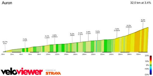 Er is natuurlijk de klim naar Auron. Officieel slechts 7,3 kilometer aan 6,9%, wat genoeg is om wat verschil te maken - maar overschat ze niet, het is geen lange klim. Wat echt schade kan aanrichten is de aanloop naar de klim, want de 25 kilometer ernaartoe hebben een licht stijgingspercentage door de hele vallei. Als een ploeg zich inzet om heel hard te gaan in deze kilometers, dan kan de slotklim zeker al beginnen met een aantal uitgeputte renners.