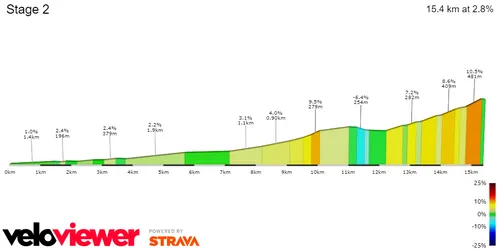 Dag 2 van de wedstrijd is een tijdrit van 15 kilometer met dezelfde finale als de openingsetappe. Er is een klim van 2 kilometer aan 5% en de laatste kilometers zullen bekend zijn voor de renners. Het is een dag voor een volledige tijdrit omdat de eerste kilometers snel zullen zijn, maar zelfs de beklimmingen zijn niet echt steil genoeg om een betekenisvolle verandering te rechtvaardigen.