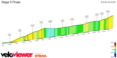 Aan de andere kant is de klim vrij consistent, met het grootste deel van de stijging rond de 6%. Er zijn enkele lichte kilometers waarop het stijgingspercentage oploopt tot 7 à 8%, gevolgd door de laatste 3 kilometer die iets minder steil zijn, rond de 4 à 5%. Hoewel er zeker kansen zijn om aan te vallen, biedt de klim ook mogelijkheden voor slipstreamen.