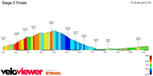 De top ligt op slechts 7,5 kilometer van de finish. De afdaling is steil en snel, maar niet extreem technisch, waardoor er snel gaten kunnen vallen. De laatste vier kilometer zijn grotendeels vlak, met een lichte oplopende strook richting de finish. Een chaotisch slot lijkt gegarandeerd.