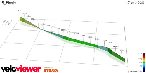 Met nog 14 kilometer te gaan, eindigt een klim van 1,7 kilometer lang met een stijgingspercentage van 5%. Op 6 kilometer voor de finish is er een kleinere klim met een vergelijkbaar stijgingspercentage. Hoewel er aanvallen kunnen plaatsvinden, lijken deze vooral bedoeld om enkele sprinters af te schudden. De pure sprinters zouden nog steeds in de mix moeten zitten, maar de laatste kilometer is ook niet ideaal voor hen.