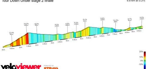 Dan hebben we een circuit van drie ronden rond Lobethal, niet veel anders dan de vorige dag. Drie kleine beklimmingen om op te merken. 1 km aan 5,7% stijging met nog 20 kilometer te gaan, 1,6 km aan 7,5% stijging met nog 8,5 kilometer te gaan en 600 meter aan 5,6% stijging met nog 4,5 kilometer te gaan. Daarna een kleine afdaling en een lichte sleep naar de streep.