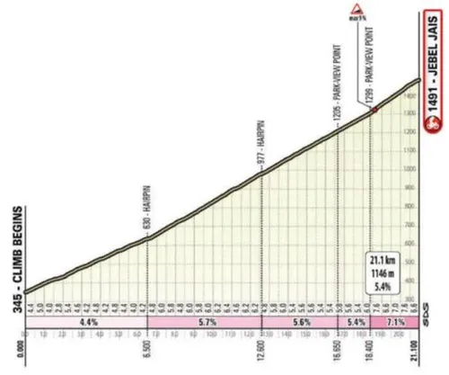 De Jebel Jais. Een klim die in de laatste edities van de rit steeds vaker werd gebruikt. Hij verdiende zijn plek als tweede bergop finish nadat de UAE Tour Jebel Hafeet als hoofdattractie had gecementeerd. Deze klim is echter een heel ander beest, want de hellingen zijn constant en nooit overdreven hoog. De hellingen beginnen vrij licht, maar in totaal is de klim meer dan 21 kilometer lang met een gemiddelde van 5,4%.